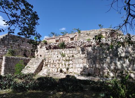 There are four main groups of structures that were built upon low hills and artificial terraces. The groups face onto a low-lying area that runs between them. While no stelae or other hieroglyphic writing has been discovered so far at the site to identify its rulers, it is thought that it had trade and political relationships with other Puuc area sites.
