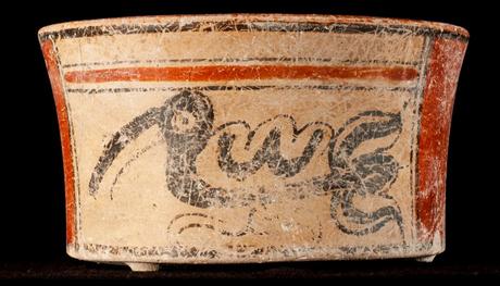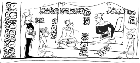 A famous ceramic cylinder from the site of Icaiche, located about 9.6 miles/16 km east of El Palmar, is known as “El Senor de Peten”. It references a lord of El Palmar and identifies five court individuals that appear in the palace scene. Two individuals bear the title “ajk’uhu’n”/ priest, worshipper. Another individual appears to be a noble heir identified as “baahtz’am ch’ok/first young man of the throne. The other two characters bear the title “sakho’ok”. One of them appears to be a ruler of El Palmar, as he also bears the titles of “baahkab”/first of the land, and “wak piit ajaw”, a title linked to the El Palmar dynasty.