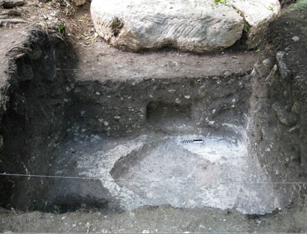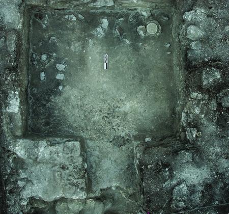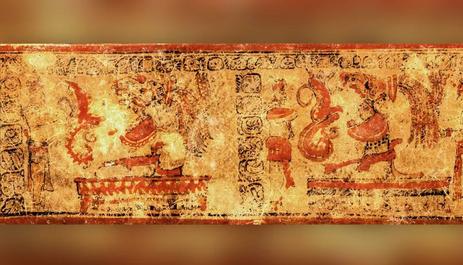 An excavation under the floor of Structure GZ1 revealed a modest burial, Burial 1, of an individual and two polychrome ceramics. One of them illustrates a palace scene depicting a fire ritual performed by a seated dignitary and attendant servants. It is thought that the person interred in the tomb was most likely Ajpach Waal himself or perhaps his father, Ajlu…Chih.