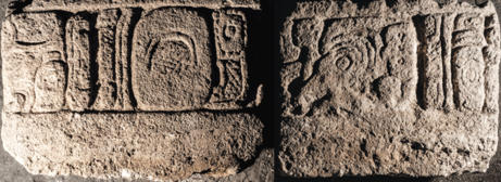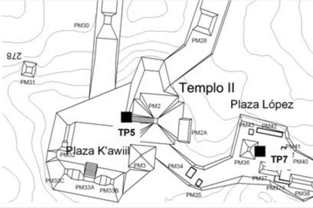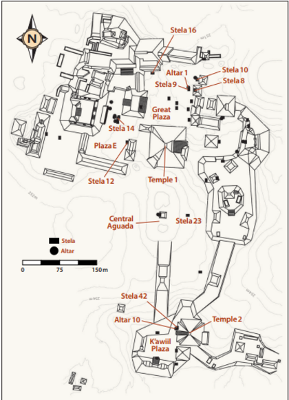 Located in front of Temple II are Stela 42 and the important Altar 10. This circular altar has a ring of 25 glyphs that commemorates the end of Katun 6 on 9.6.0.0.0, 9 Ajaw 3 Wayeb/March 22, 554 CE by the ruler named in the text as K’ahk’ P’uhlaj Chan Yopaat Jatam? … K’awiil Tok’?, Sakho’ok?, lord of Wak Piit. The iconography on the altar’s face displays a cuneiform cross with deities in the corners. An image in the center may represent K’ahk’ P’uhlaj Chan Yopaat, impersonating the solar deity K’inich Ajaw. A cache was recovered in front of the altar that contained 9 flint objects, 25 cores and 19 obsidian flakes. This cache discovery was similar to that excavated in front of the temple associated with the Central Aguada.