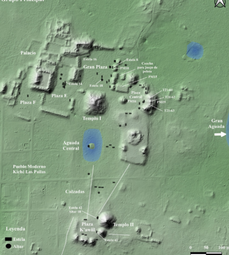 The Main Group was built around the Central Aguada (reservoir) reflecting a sacred cosmology. On the north and south sides of the reservoir are located two temples having the largest pyramidal bases at the site, Temple 1 and Temple 2. More than 100 structures have been recorded, mostly formed around eight plazas that includes a ball court. A small temple, Structure PM29, is located in the center of the aguada. A plain stela, Stela 23, and altar, Altar 3, are located on its western side. A cache was recovered beneath the stela that contained 25 flint flakes and fragments, three flint leaf shaped knives, and an obsidian core.