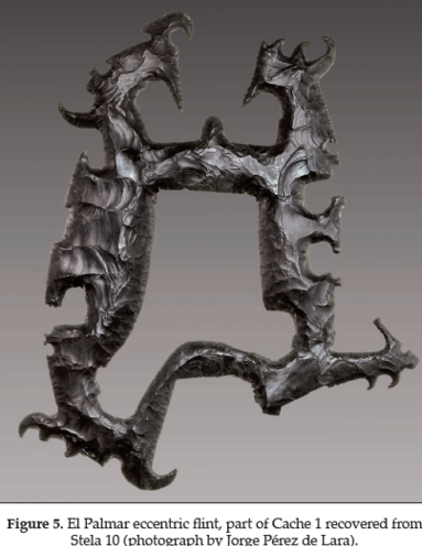 Situated on the north side of the Central Aguada is Temple I, with a height of 98.5 feet/30 meters, and is the largest structure at El Palmar. The temple -pyramid closes off the south side of the Great Plaza. This plaza is the largest at the site, and includes numerous structures ranging from pyramids, temples, a palace complex, range type platforms, and a ball court. Twelve stelae and three altars have been recovered within the plaza. Six of the stelae, (Stelae 6, 8, 10, 16,18, and 37) have recoverable information detailing ritual activities that took place between 731-800 CE. The activities were based around Period Ending events depicting a scattering ritual/”chok ch’aaj”. A cache recovered under Stela 10 revealed a stunning example of lithic art. An intricately carved eccentric flint depicts the silhouettes of four deity heads that frame each of the corners.