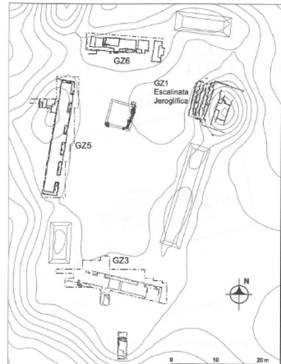 Termination rituals were discovered on the floors of buildings GZ1 and GZ6, and have been dated to c.850 CE. Structure GZ6 is located on the north side of the plaza. It is a rectangular structure exhibiting three vaulted chambers. The group was abandoned sometime after that date.