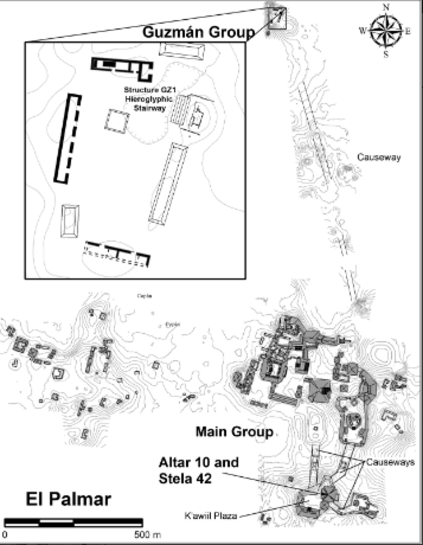 The Guzman Group is an outlying group reached by a sacbe about .78 mile/1.3 km northwest of the Great Plaza that passes by other small architectural groups. It is a residential group set around a small plaza ringed by six structures. On the west side of the plaza is a small temple set on a platform, Structure GZ1 with a height of around 9.8 feet/3 meters. A hieroglyphic stairway was uncovered during excavations. The text reveals a narrative relating to members of an ancestral lineage who performed as emissaries/flag bearers/“Lakam”, to successive rulers of El Palmar over an extended period of time. This type of non-royal, ancestral lineage group has also been recently recorded at Group J in Palenque, a lineage group there bearing the title “Yajaw K’ahk’” Lord of Fire.