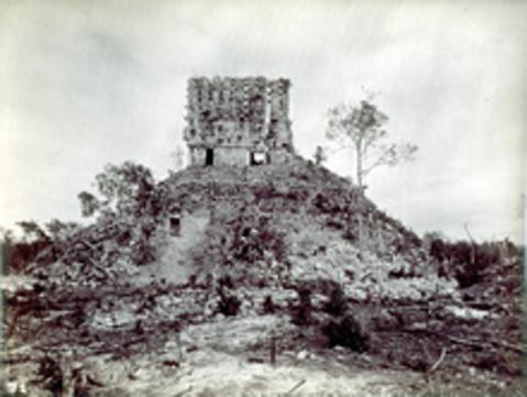 Returning back to the Grand Plaza, one takes the raised sacbe (raised white stone road) south that leads to the towering pyramid-temple, El Mirador. Only the temple atop the mound has been restored. It is of an Early Puuc Style composed of five vaulted rooms. It once had multiple doorways (see Henry Sweet photo c.1890 below). There is an open-work roof comb that crowns the temple giving the illusion of even greater height and grandeur. There were perhaps two human figures in each corner, and one above the center of the south façade. All that remains are feather and rosette motifs, as well as red, green, and blue paint. Below the temple there appears evidence of an earlier construction revealed by fallen parts of the pyramid. It is hoped that at some point the pyramid base will be restored.