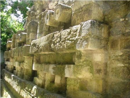 Structure B15 is a large step pyramidal structure situated on the west side of the East Patio, and is also known as the Five Story Palace. The pyramid exhibits stairways on three sides, and has four distinct terrace levels reaching a total height of 98 feet/30 meters. On each terrace level are several vaulted chambers connected lengthwise. Excavations have revealed several earlier palace sub-structures located beneath the current structure and feature decorative motifs.