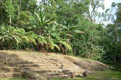 There are a numerous stone sculptures, altars, and stelae located in the Central Group. Structure 5 is a pyramidal structure, and Structure 6 is a stepped platform. Structure 12 on Terrace 2 is a 16 foot/5m high three tiered platform containing 2 wide stairways. In front of the west façade of this structure is Stela 5 the most important stela at the site. It features two kings possibly recording a succession ritual. They are separated by a central panel containing two dates, one associated with each ruler. The right-hand date refers to 8.2.2.10.5, August 21, 83 A.D., a very early Maya date, and possibly the date of accession of this king. The left-hand date reads 8.4.5.17.11, and equates to June 6, 126 A.D., the date of possible succession. If this is indeed the case, it is a rare, early example of Maya kingship ritual.
